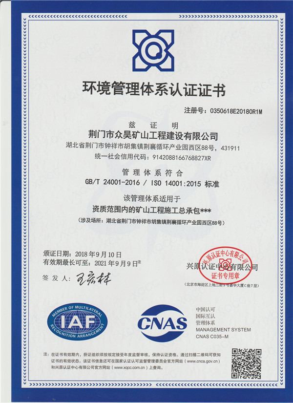 環(huán)境管理體系認(rèn)證證書